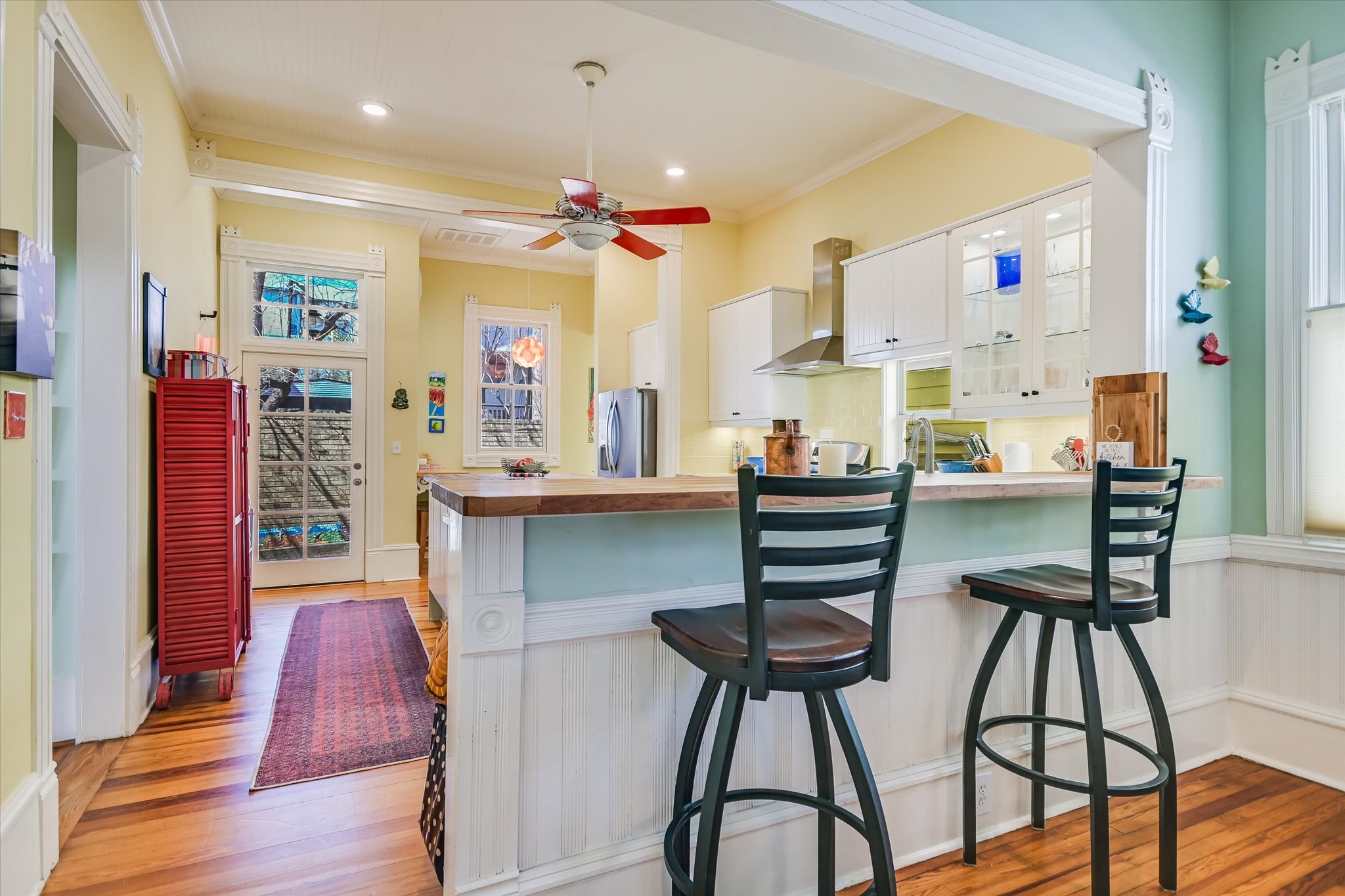 This vibrant lot supports a diverse urban biology. Usually secretive about her nest, the resident mourning dove has returned for a third year to raise her babies in view of the kitchen window. A cardinal pair has set up a nest in the front yard and are often seen at the bird feeder, where they must compete with the squirrels. On a single day in March of last year, a bird app recorded the songs of the Northern Mockingbird, Eastern Phoebe, Carolina Wren, Red-Winged Blackbird, Northern Cardinal, Blue Jay, American Robin, and White-winged Dove. In Dec, the visitors included a Red-bellied Woodpecker, Black-crested Titmouse, Yellow-rumped Warbler, and Orange-Crowned Warbler—all heard or sighted from the front porch. A bank of perennial milkweed plants in the side kitchen garden hosts migrating monarch butterflies and the occasional hummingbird. Not to forget the reptiles, the family of green anole lizards bring their lime-colored bodies with red throats to warm on the porch. Electra the cat has also found joy in the beams of sunlight whether inside the home or on the porch. The natural habitat is likely what you would have found in 1893 with pecan trees and wildlife, all surrounded by a white picket fence.